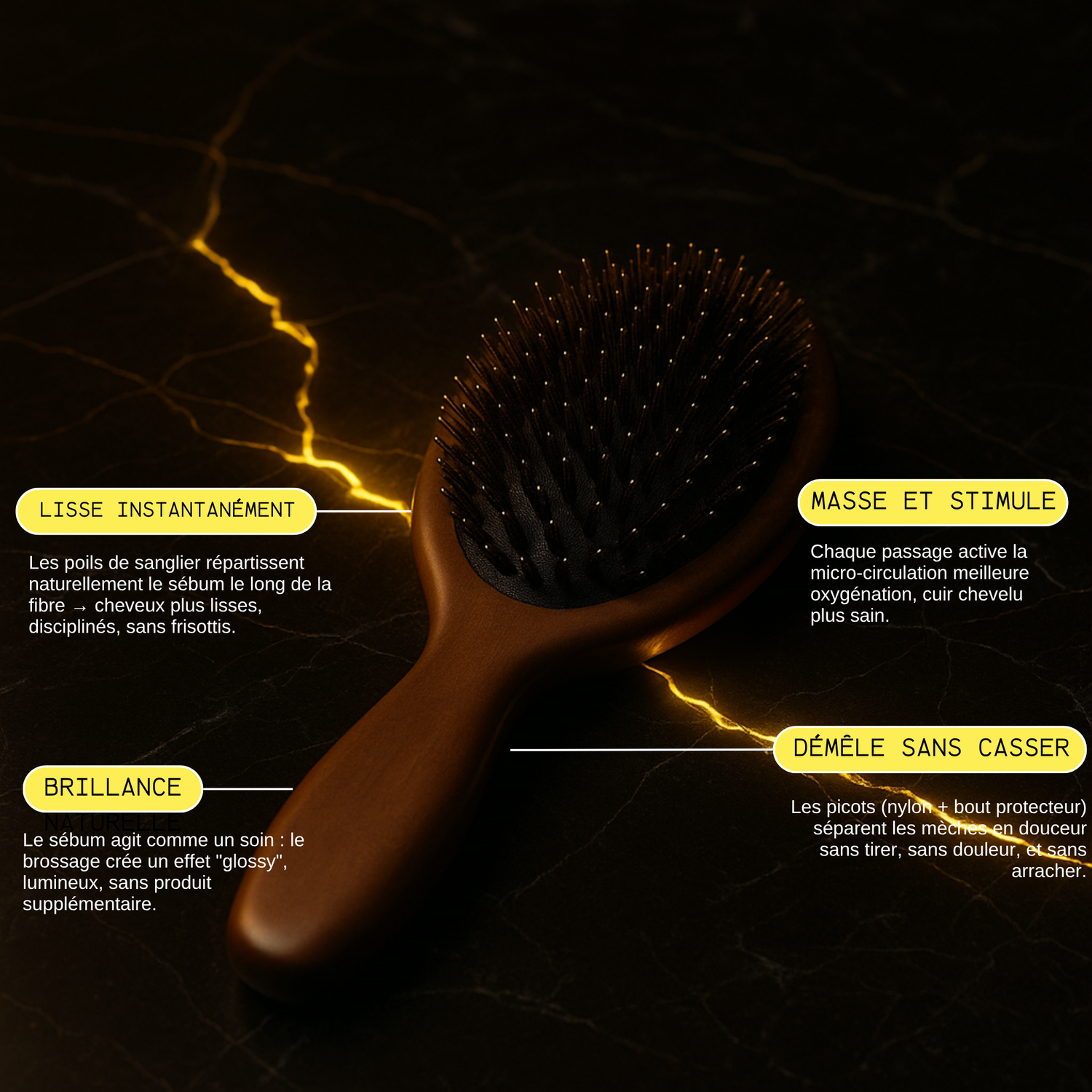 - Lisse instantanément : les poils de sanglier répartissent le sébum pour des cheveux disciplinés et sans frisottis.